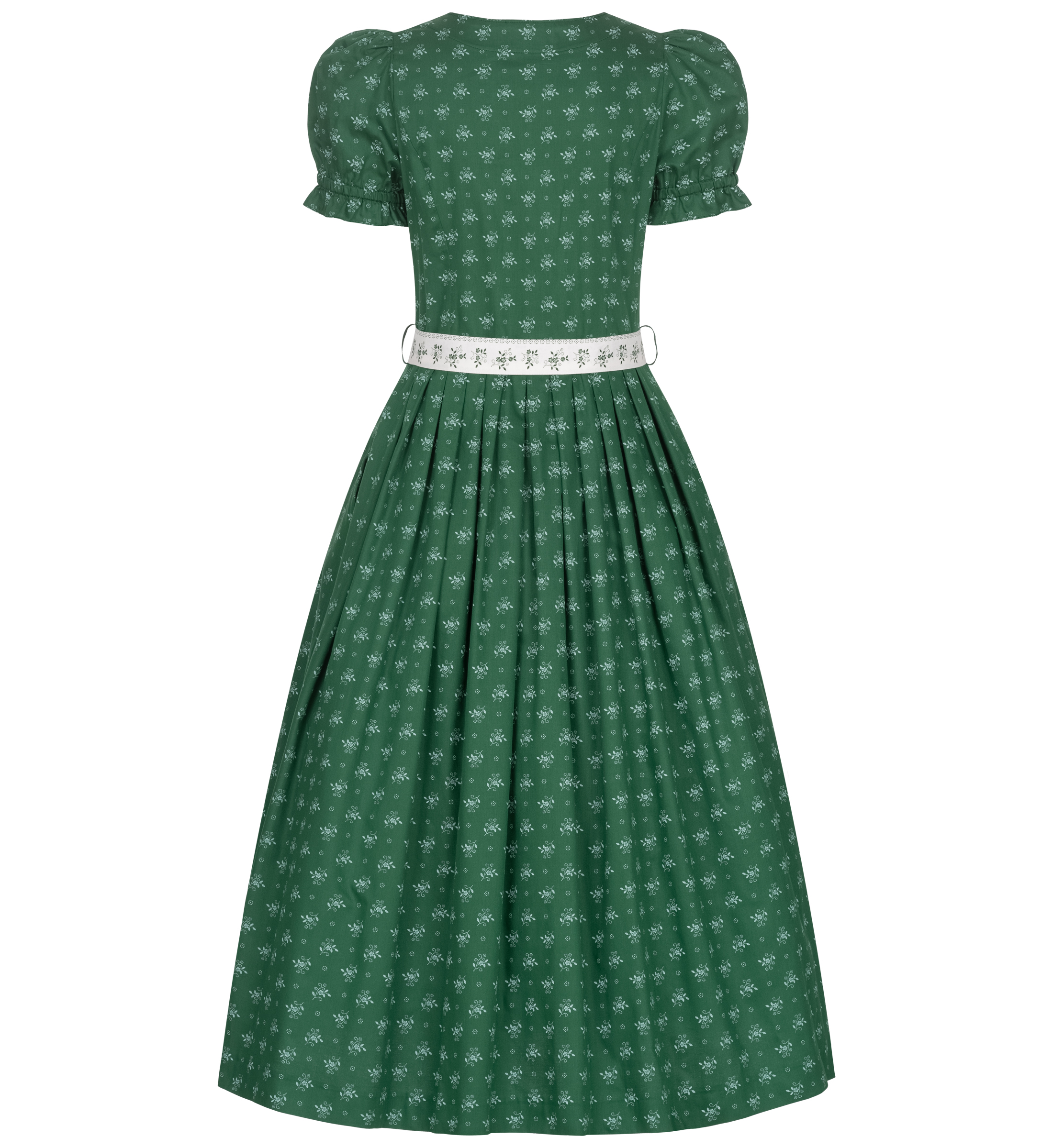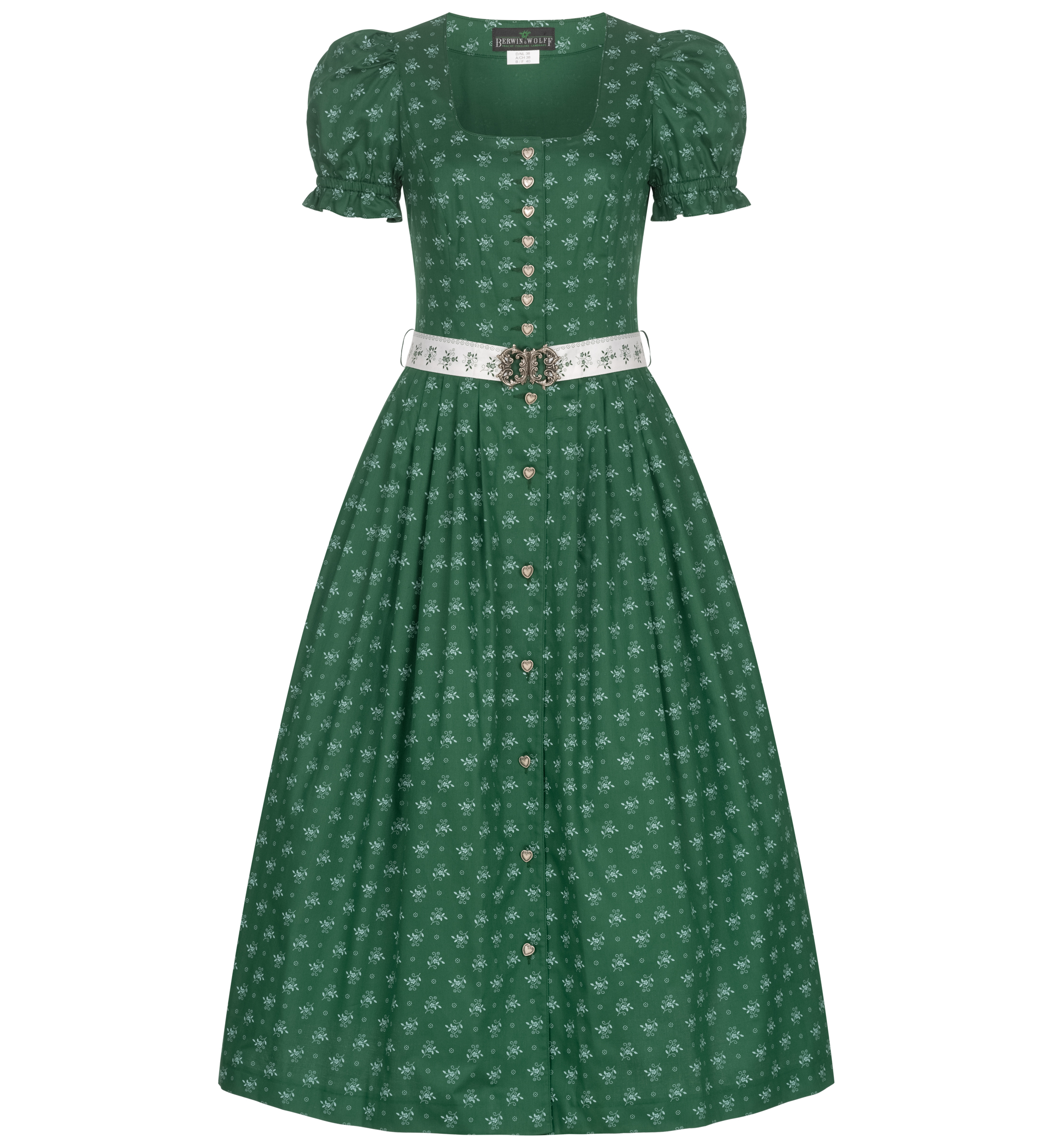Schlichtes Trachtenkleid in grün mit weißen Blümchenstreuern aus der Kollektion von Berwin & Wolff. Das Landhauskeid mit kurzen Puffärmeln ziert eine durchgehende Knopfleiste mit Knöpfen in Herzform und kleiner Blümchenprägung. Das Highlight ist der weiße Gürtel mit grünen Blumen und einer Metallschließe. In das Rockteil des Kleides sind zwei Eingriffstaschen eingearbeitet. Die leichte Baumwollqualität bietet hohen und bequemen Tragekomfort. Die Kurzgrößen bieten vor allem kleineren Damen eine gute Passform.