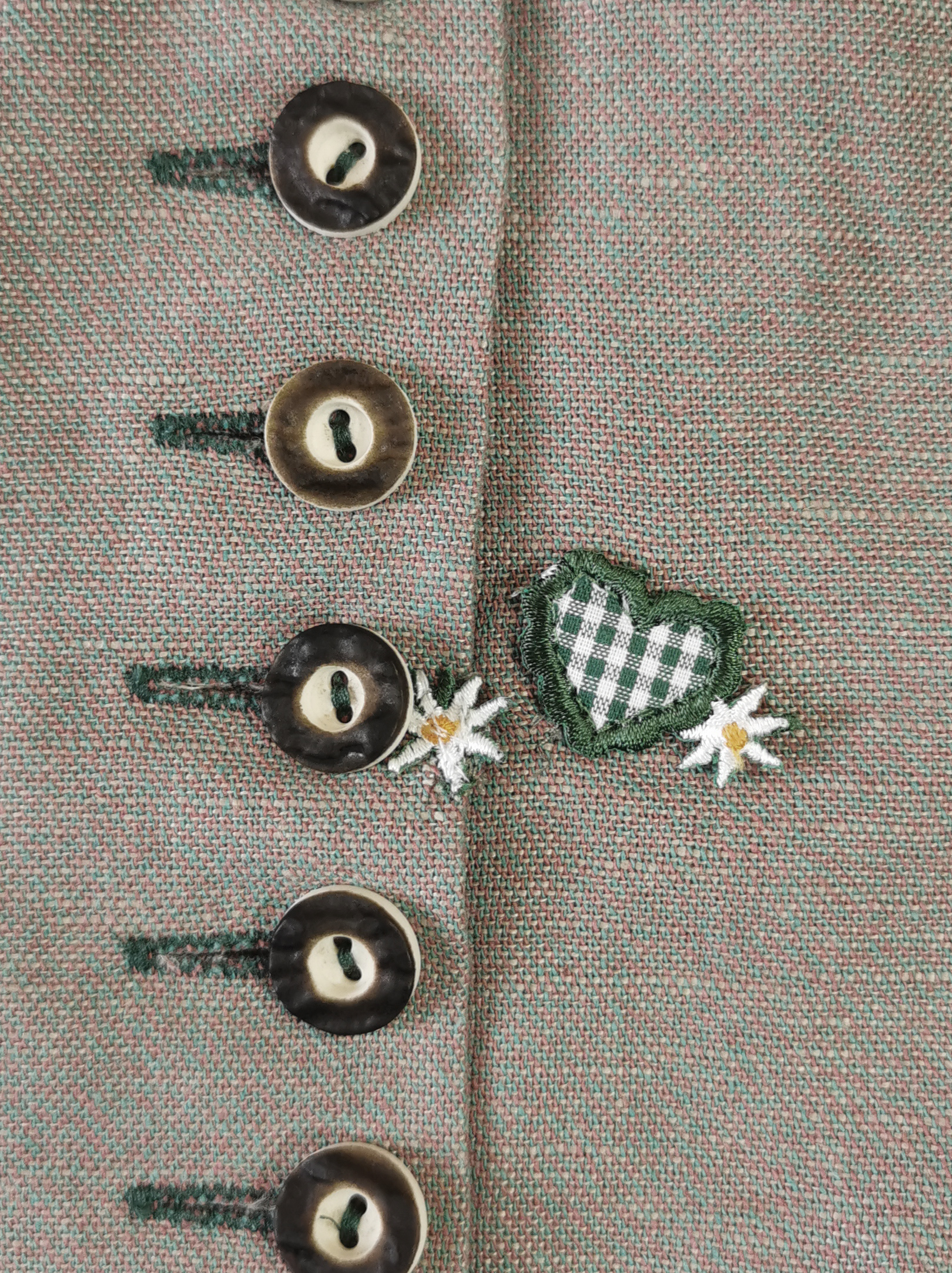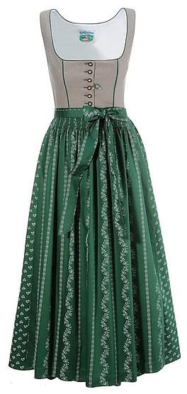 Klassisches langes Dirndl, für viele Anlässe. Das naturfarbene Mieder wird mit einem Herz und Edelweiß aufgehübscht und kommt mit einem praktischen Knopfverschluss in Hornoptik. Der grüne Rock wird mit weißem Streublumenmuster dekoriert. Die grüne Schürze ziert traditonelles Streifenmuster.