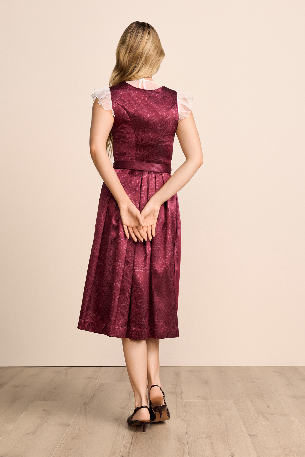 Mit seinem ausdrucksstarken Design zieht das Dirndl Lysarae alle Blicke auf sich und begeistert Liebhaberinnen traditioneller Trachtenmode. Der klassische Herzausschnitt setzt das Dekolleté stilvoll in Szene, während das schimmernde All-over-Muster dem Dirndl eine besondere, elegante Note verleiht.