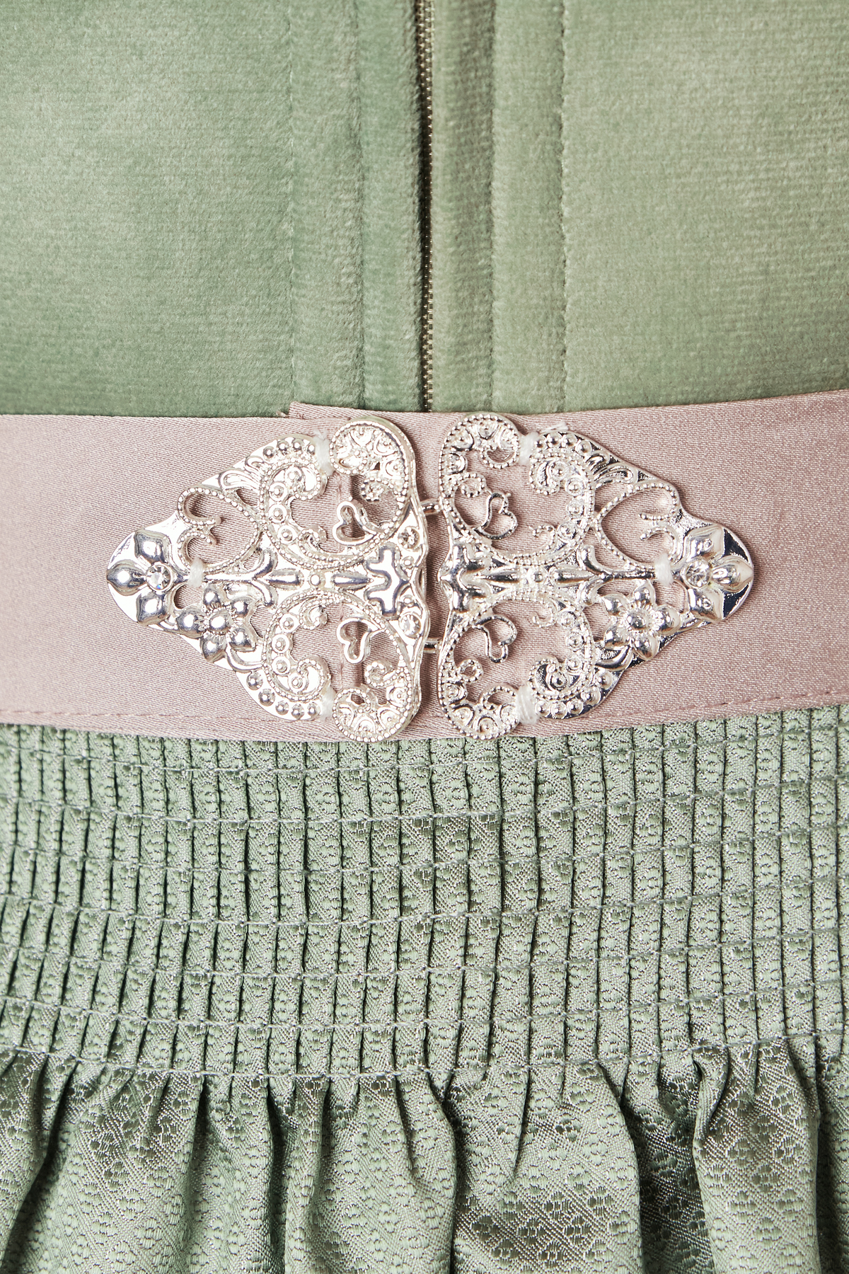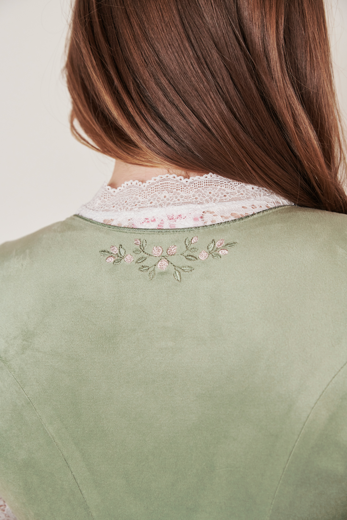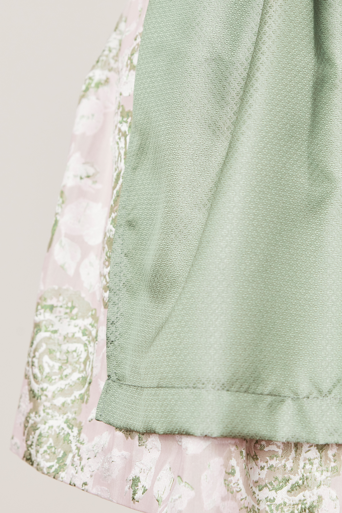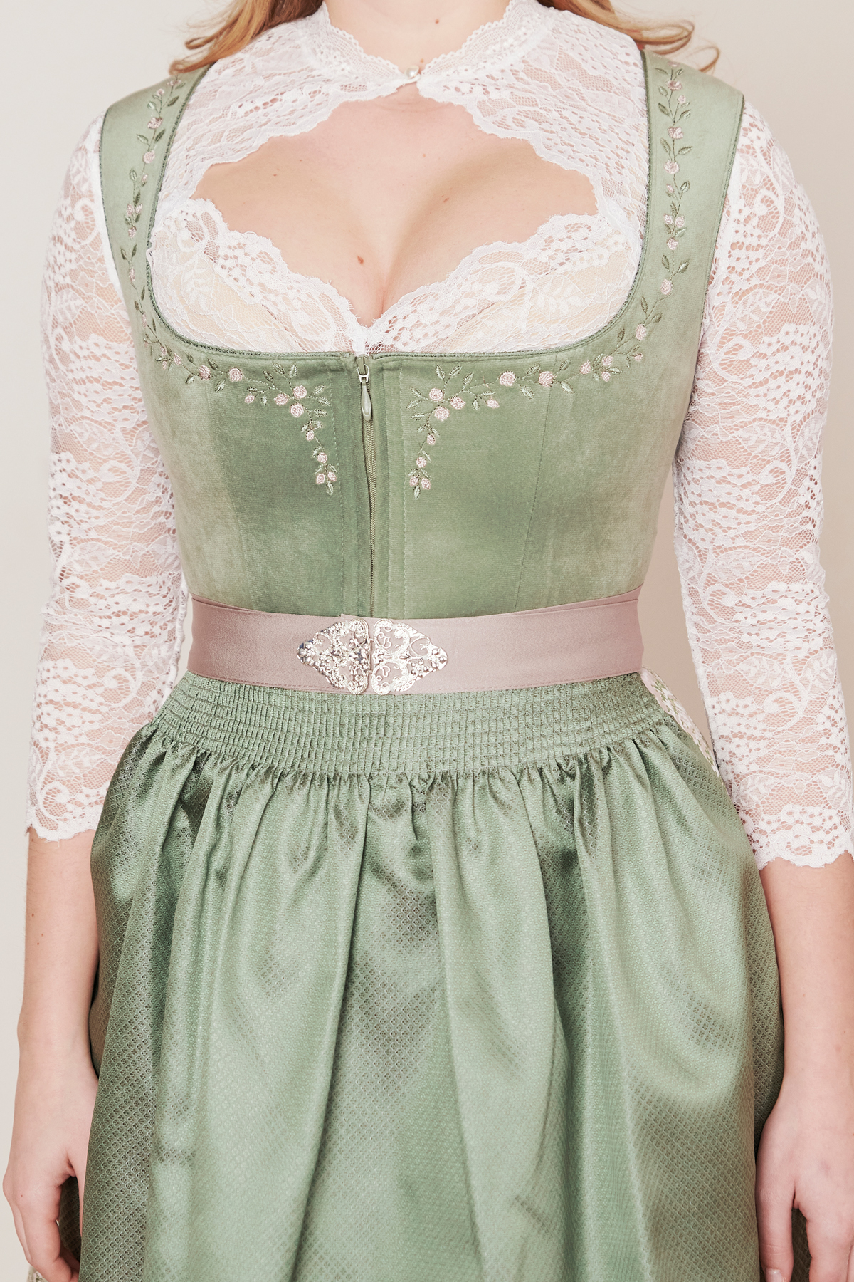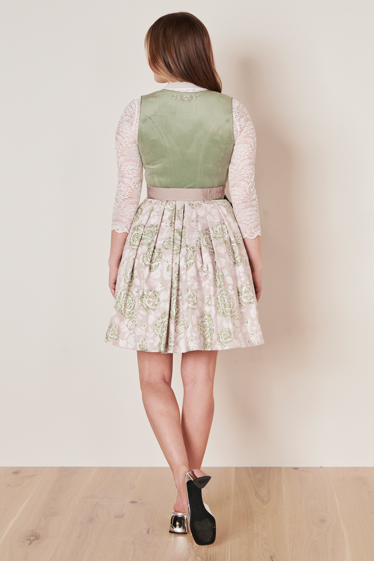 In Kürze: Dirndl mini, Rocklänge: ca. 50 cm, Farbe: grün, florales Muster, Blumenstickerei vorne und hinten, Balkonett-Ausschnitt, Eingriffstaschen, Reißverschluss, Schürzenschließe