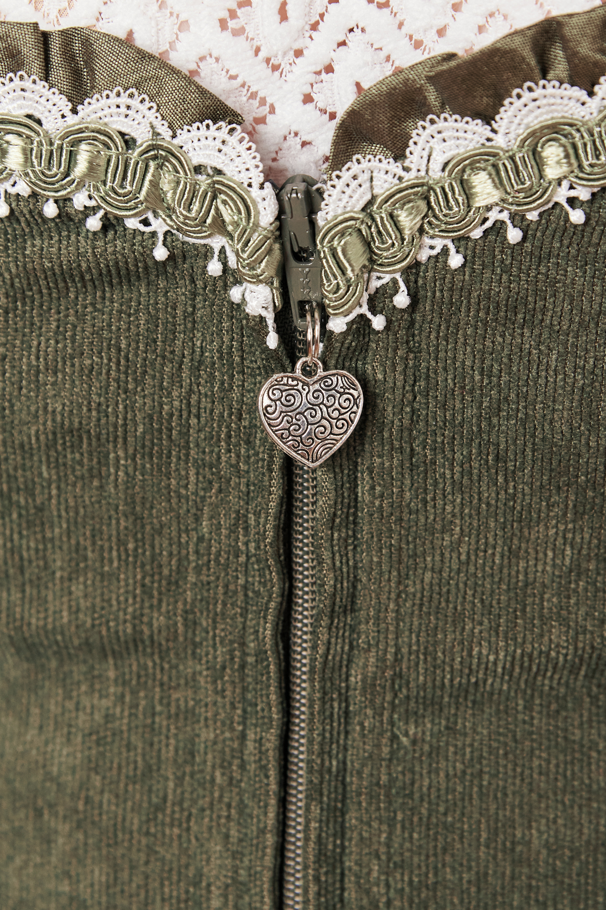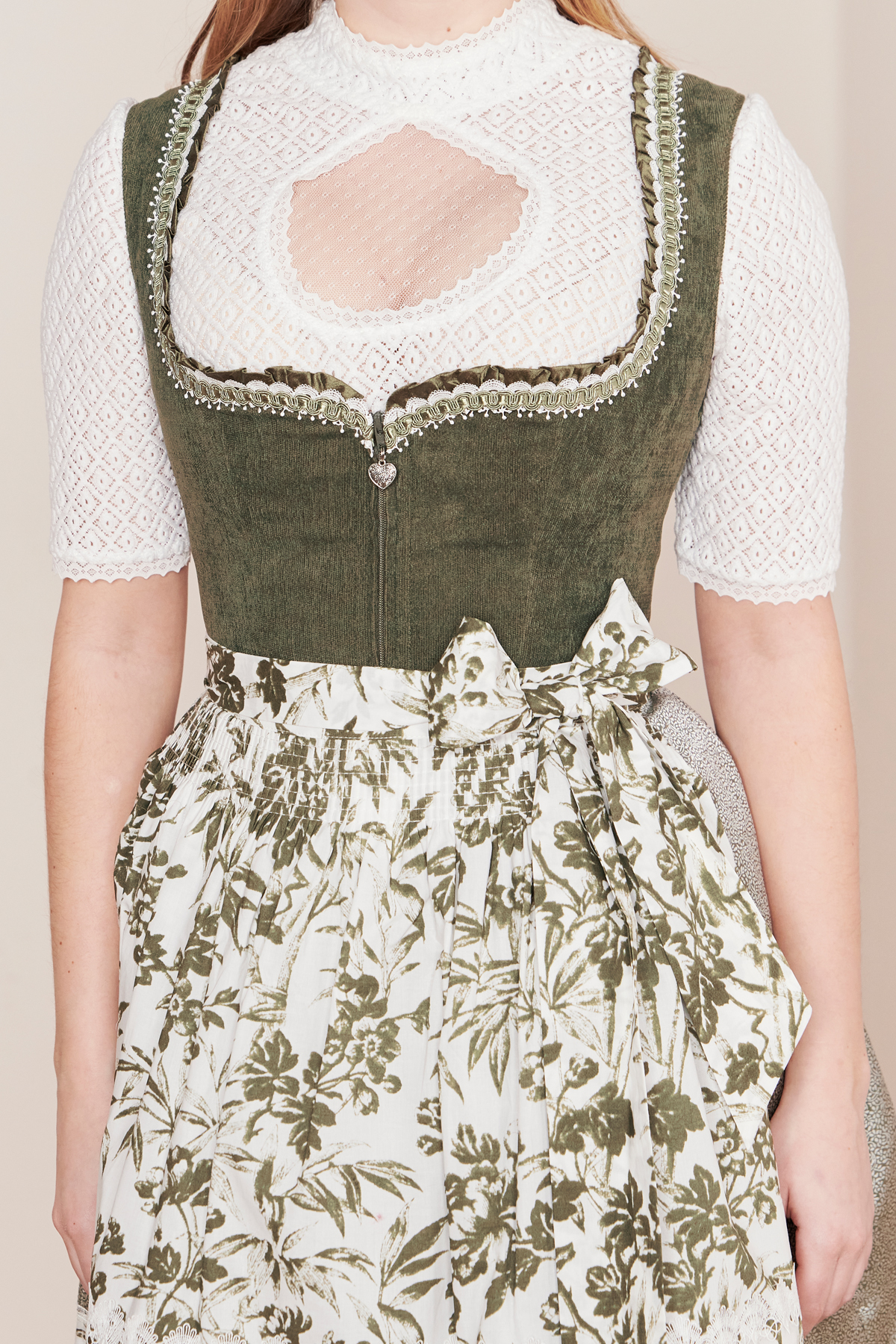 In Kürze: Dirndl mini, Rocklänge: ca. 50 cm, Farbe: oliv / grün, Samt, Wildlederoptik, Eingriffstaschen, Blumenmuster, Reißverschluss, Herzausschnitt