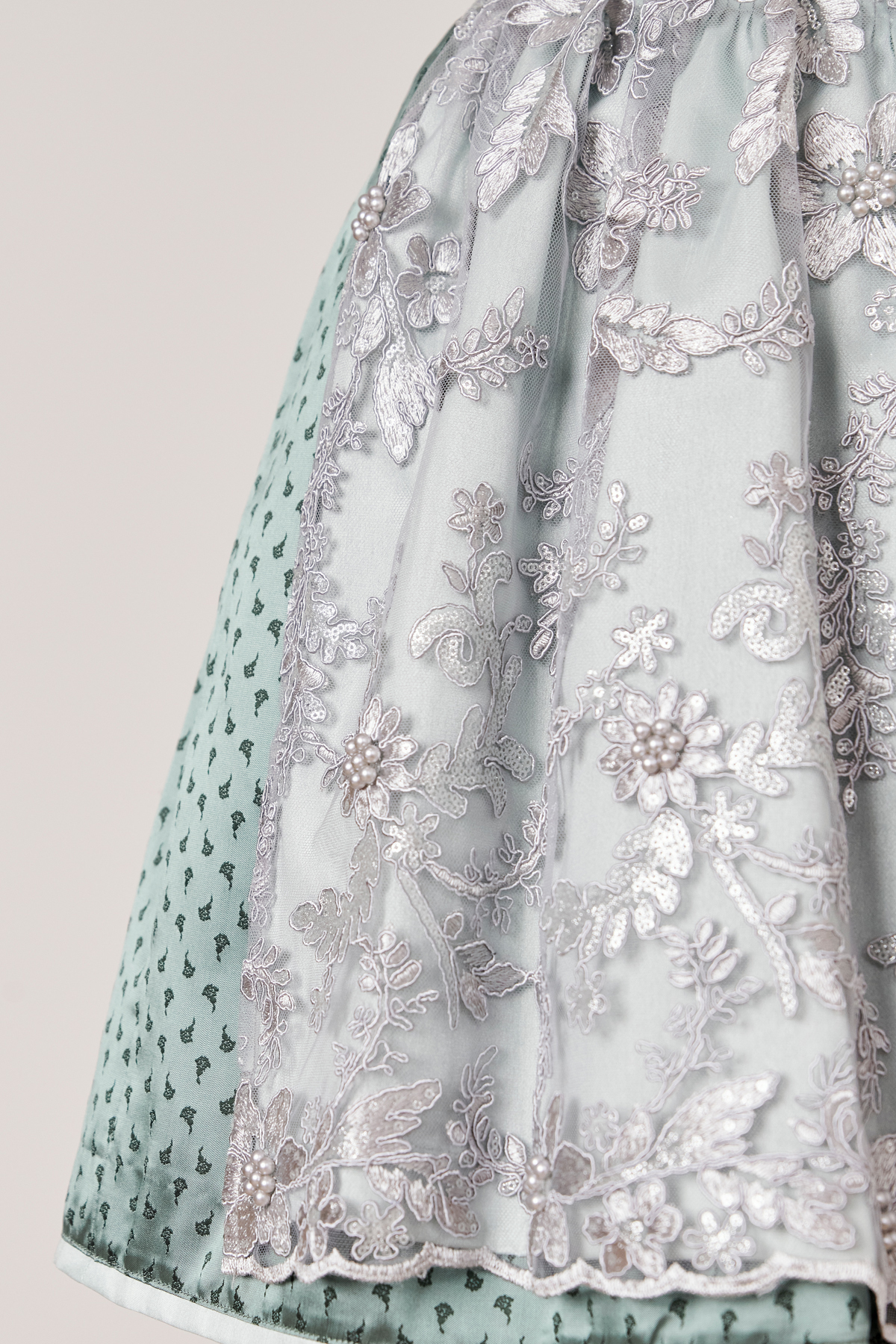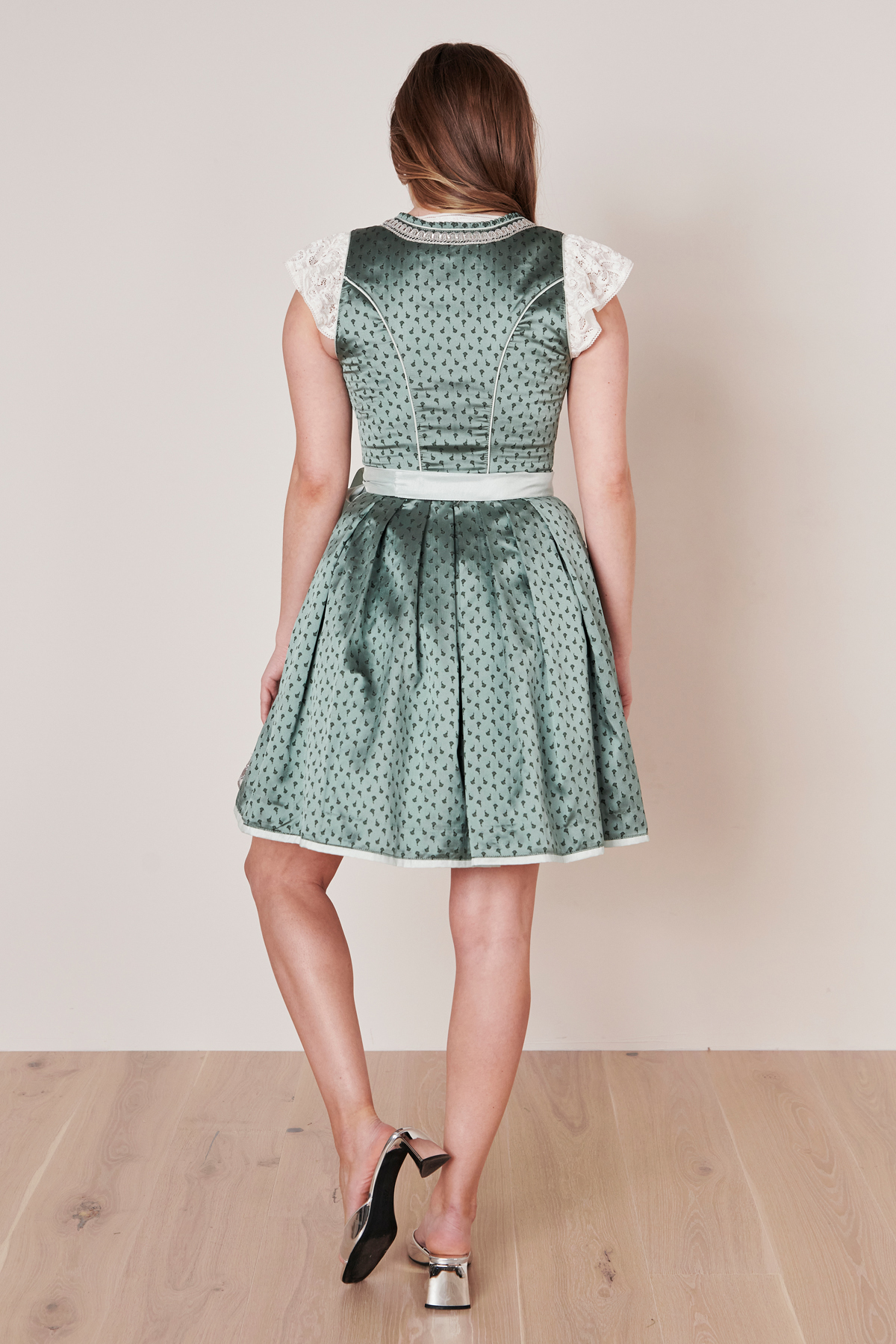 In Kürze: Dirndl mini, Rocklänge: ca. 50 cm, Farbe: grün, Streublumen-Muster, Eingriffstaschen, Reißverschluss, Herzausschnitt, Miederschnürung, Perlenschürze