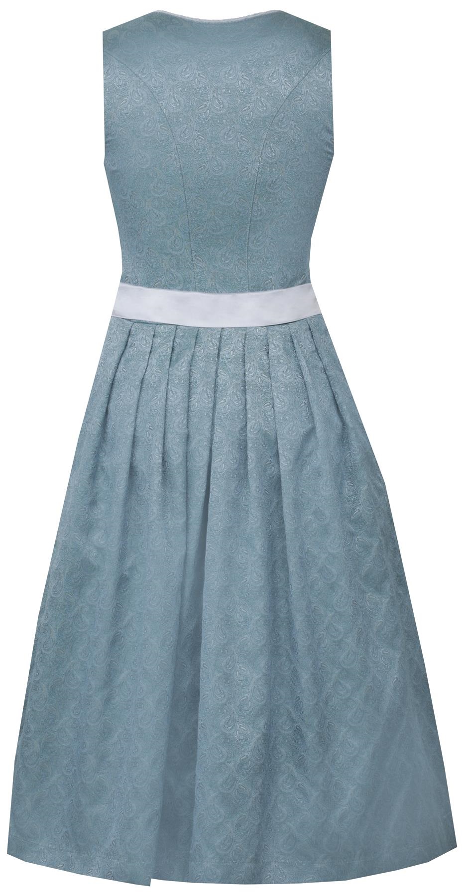 In Kürze: Dirndl "Bechhofen", Farbe caprinblau / hellgrau, Mididirndl mit einer Rocklänge von ca. 70cm, hellgraue Schürze aus Jaquardstoff, Reißverschluss mit Dekorzipper, Kleid capriblau mit tollem Muster