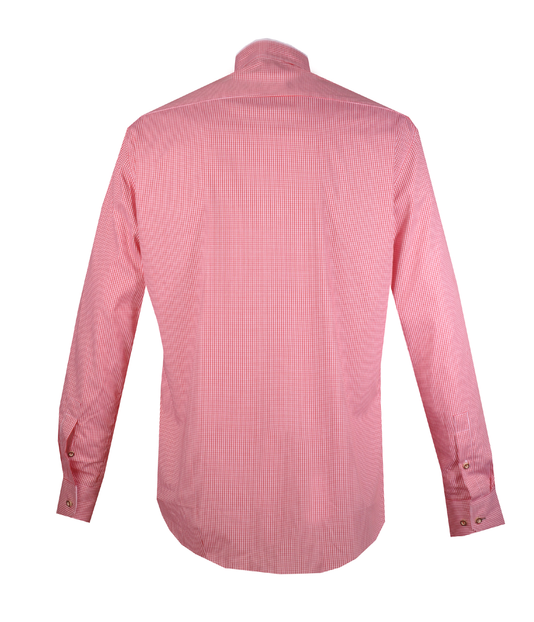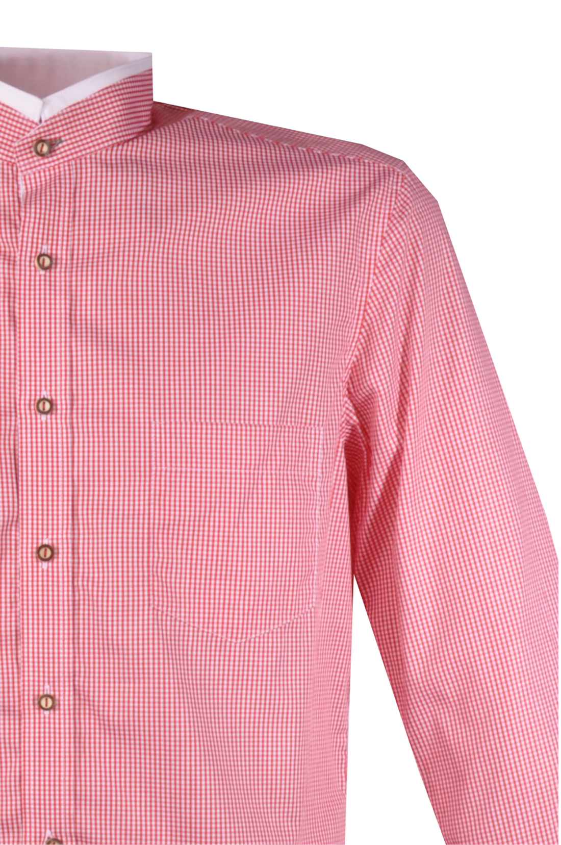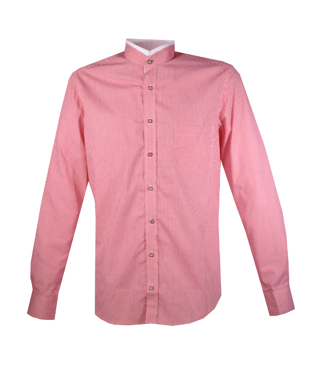 In Kürze: Trachtenhemd, Langarm, Stehkragen, Kontrastfarbe weiß, 100% Baumwolle, rot / weiß kariert, Knöpfe in Hirschhornoptik