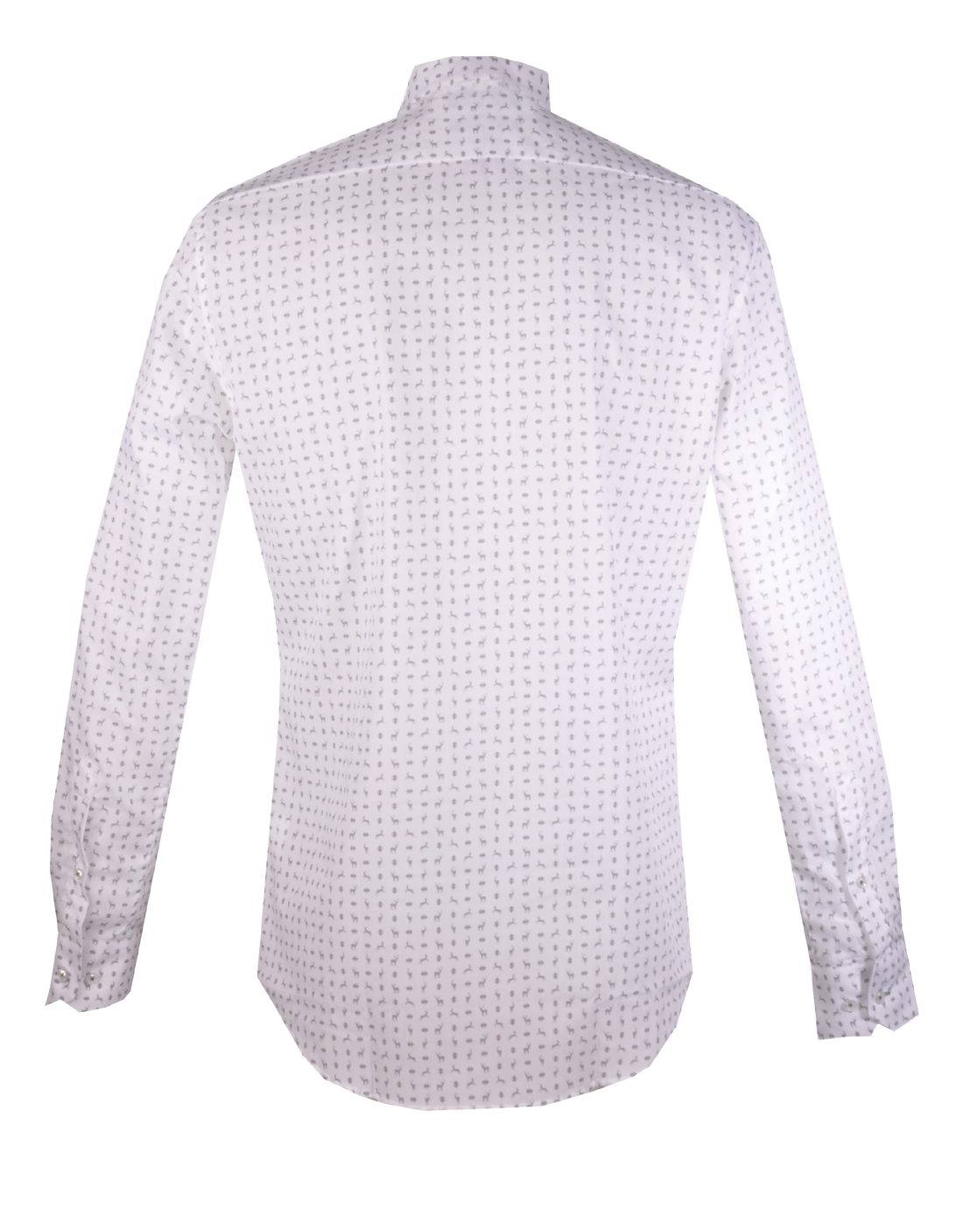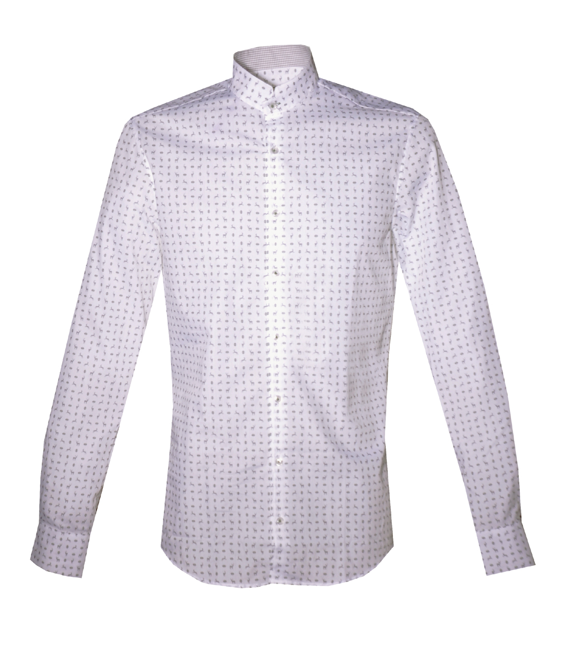 Elegantes Herrenhemd in weiß mit edlem Hirschmotiv in grau von Gloriette. Der Stehkragen und die Manschettenknöpfe sind mit einem Kontraststoff in blau / weiß versehen. Tolle Knöpfe in Perlmuttoptik runden das Gesamtbild ab. Ein langärmeliges Hemd für besondere Anlässe.