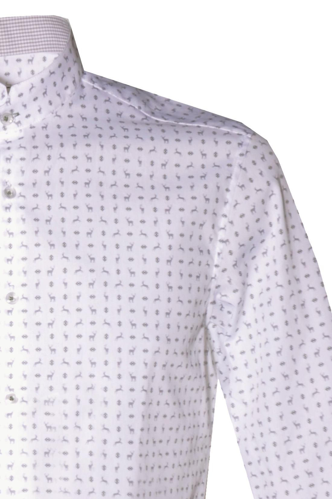 in Kürze: Trachtenhemd, Farbe: weiß / grau, Hirschmotive, Kontraststoff kariert grau / weiß, langärmelig, Knöpfe in Perlmuttoptik, Stehkragen